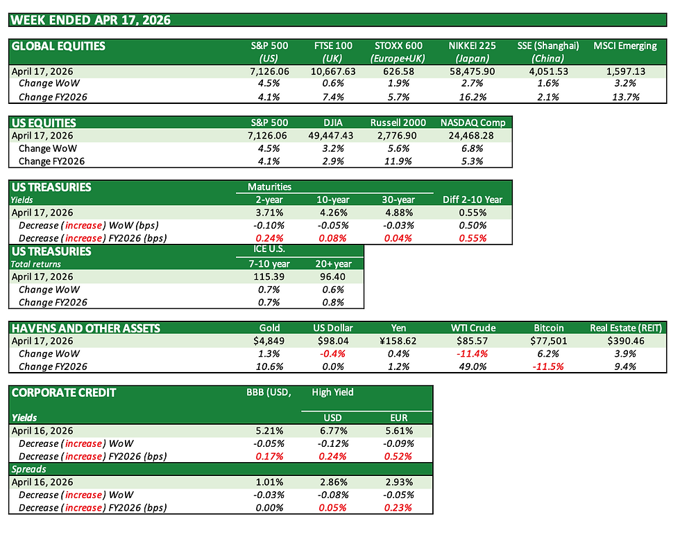 Global stocks continued their recovery across nearly all markets last week, led by emerging markets stocks and U.S. stocks. European stock markets were slightly more tempered, but still powered forward as risk appetite returned. Friday’s party-time sentiment ratcheted up another notch when the announcement came on Friday that the Strait of Hormuz was reopen for traffic. Bond investors remain more nuanced, although bonds also got a boost from Friday’s news with yields falling around 3bps-10bps across the curve WoW, although intermediate and long-term yields are still stubbornly high. The price of crude oil plummeted, and the greenback weakened, both as a result of an improved outlook regarding the end of the conflict. Corporate bond spreads tightened, and both gold and Bitcoin moved higher. The table below illustrates last week’s and YtD performance of the indices and asset prices tracked by EMC.