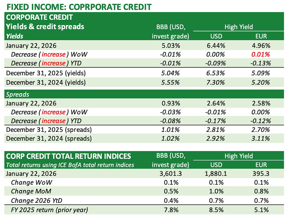 U.S. and European stocks were weaker last week, as Asian equities outperformed. Chinese and emerging markets stocks were the best performers, both gaining on the week. YtD, Asian and emerging market stocks have been the place to be. US Treasuries were volatile, with yields spiking mid-week but then settling and being little changed WoW across the curve. Precious metals continue to be the star performers, with gold closing up 8.4% WoW. The safe haven asset is already up 14.3% YtD, following its 2025 gain of 65.1%. Corporate bond spreads were little changed on the week, both in investment grade and high yield. In currencies, the US Dollar closed sharply lower WoW, and the Yen gained ground, rallying on Friday as expectations regarding intervention developed. Bitcoin was lower last week, closing back below $90,000 but holding on to modest YtD gains. The question that is confounding remains the same: why are risk assets like stocks rallying at the same time as risk-off assets like gold? Something will have to eventually give.